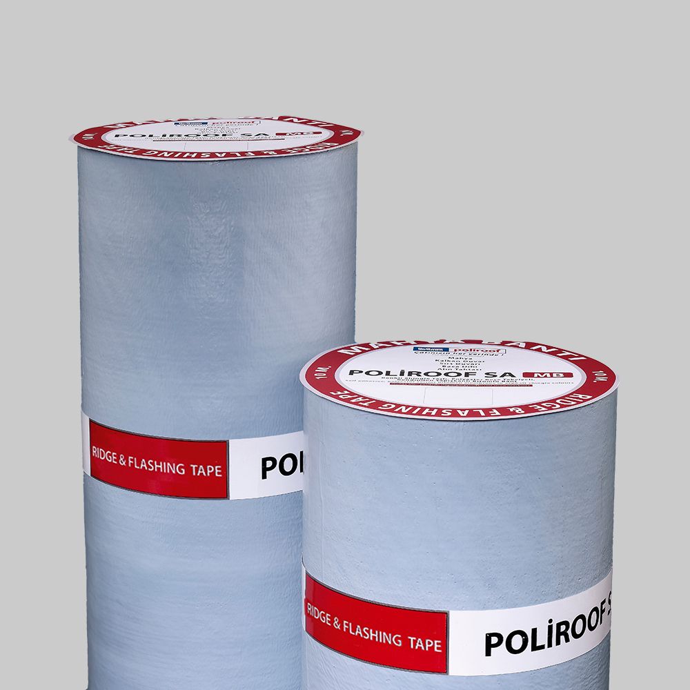 Poliroof SA MB, providing permanent, practical and economical solutions in details such as roof ridge, gable wall, back wall, chimney flashing and eaves plate covering, is covered by coloured shingle granules and has polyester mat and self-adhesive bitumen layer.