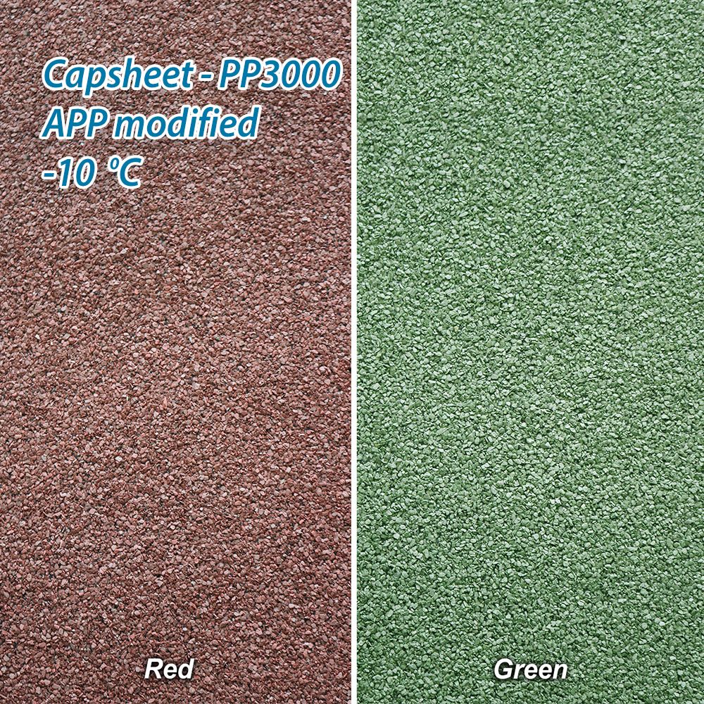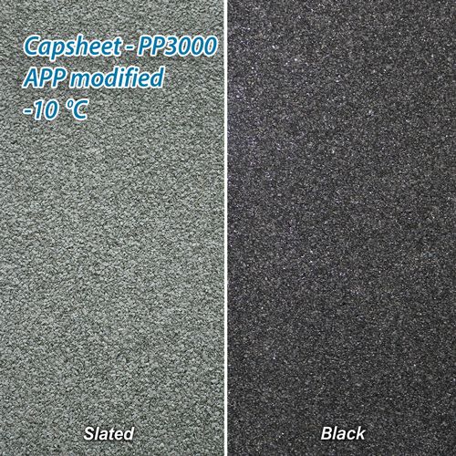 Plastobit is a fiberglass or polyester felt reinforced waterproofing membrane made of bitumen modified with APP (atactic polypropylene), the lower surface is coated with PE (polyethylene) film and the upper surface is coated with PE (polyethylene) film or colored granules and applied with an oxyacetylene burner.