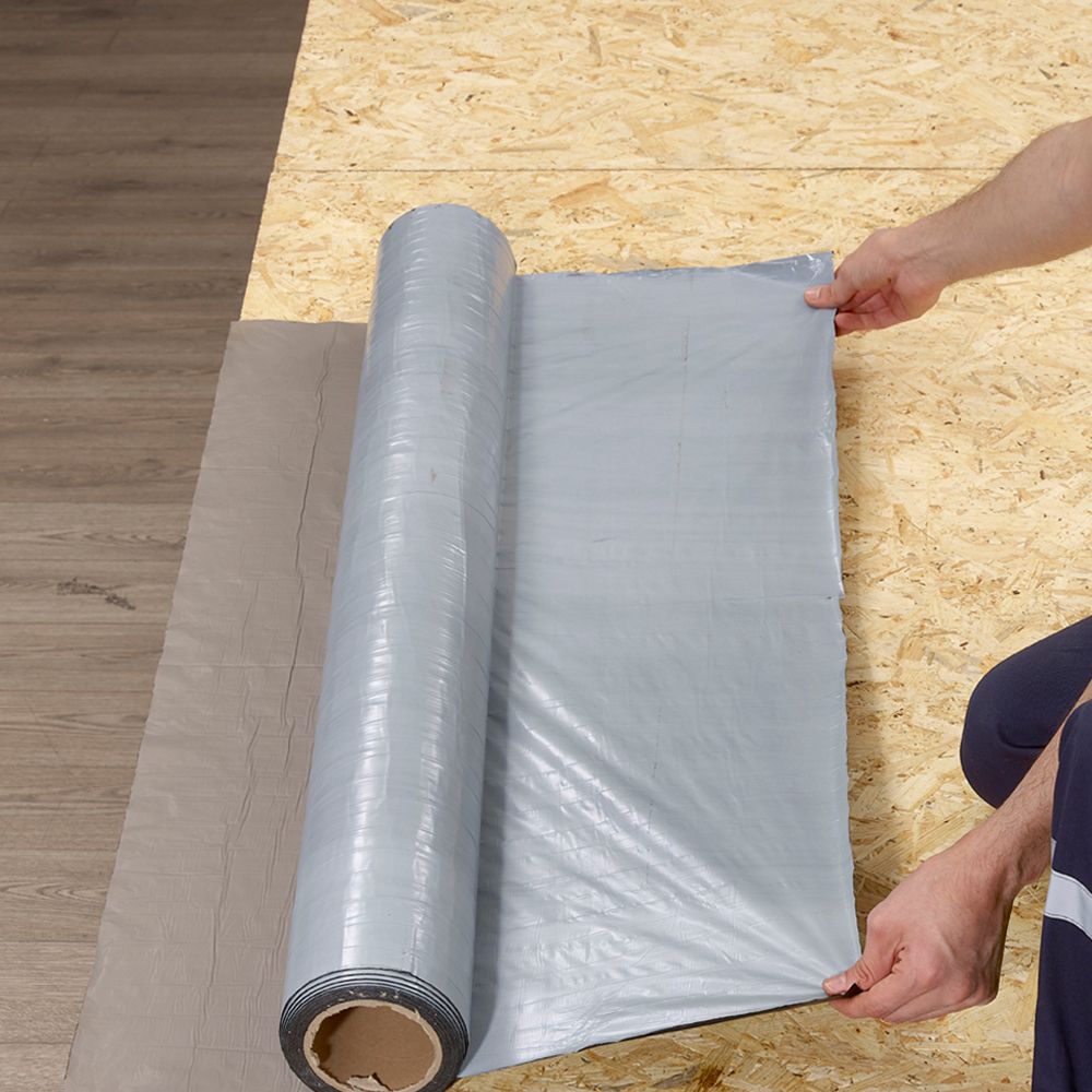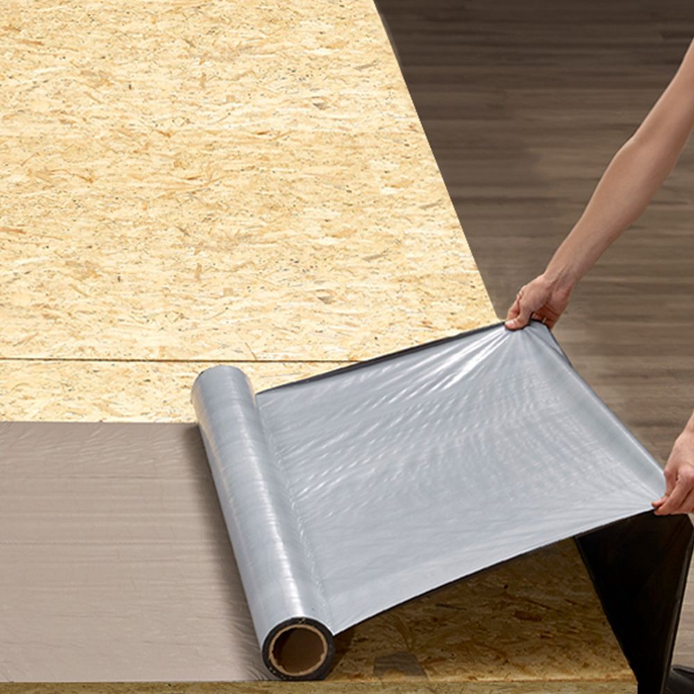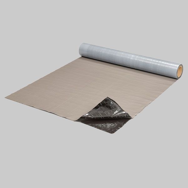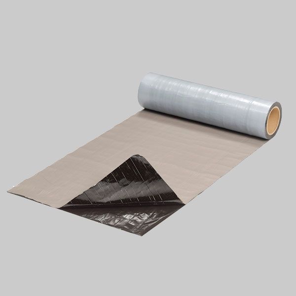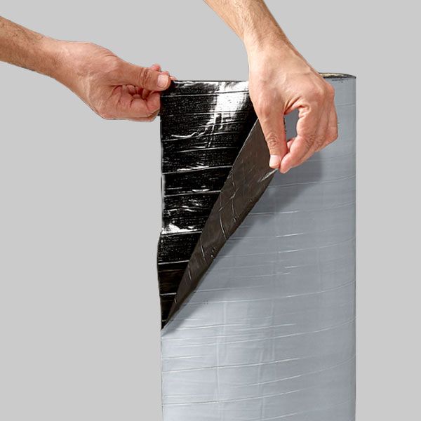 Self-adhesive waterproofing membrane with SBS modified bitumen. Top surface is made of laminated matt grey aluminum foil with UV resistance. Bottom surface is self-adhesive, made with removable siliconized film.